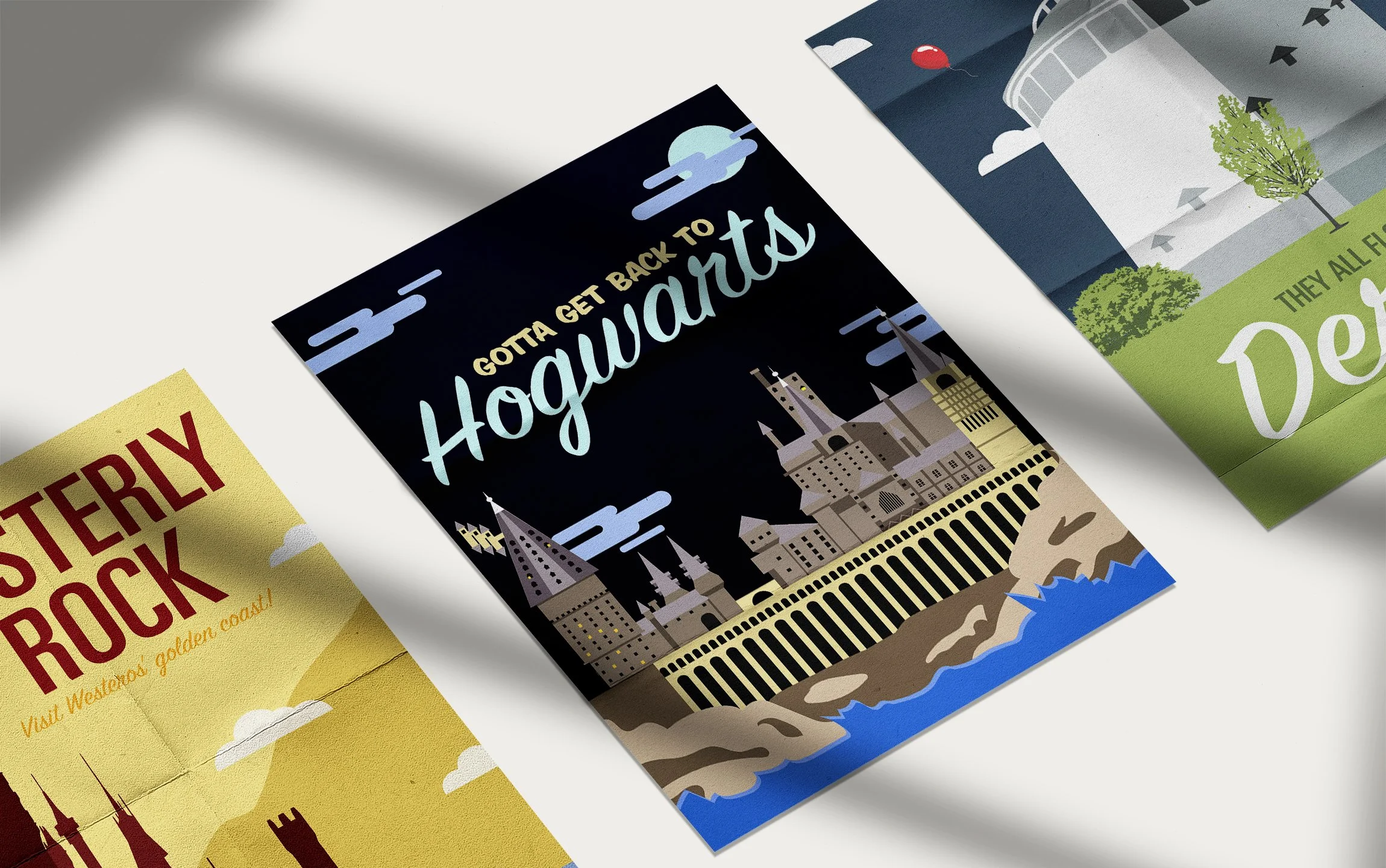 A series of illustrated posters celebrating film and literature’s most iconic destinations. Originally created as personal studio work, the collection expanded through commissioned requests after being shared on social media. Fictional settings are presented as destinations, where travel and story overlap.